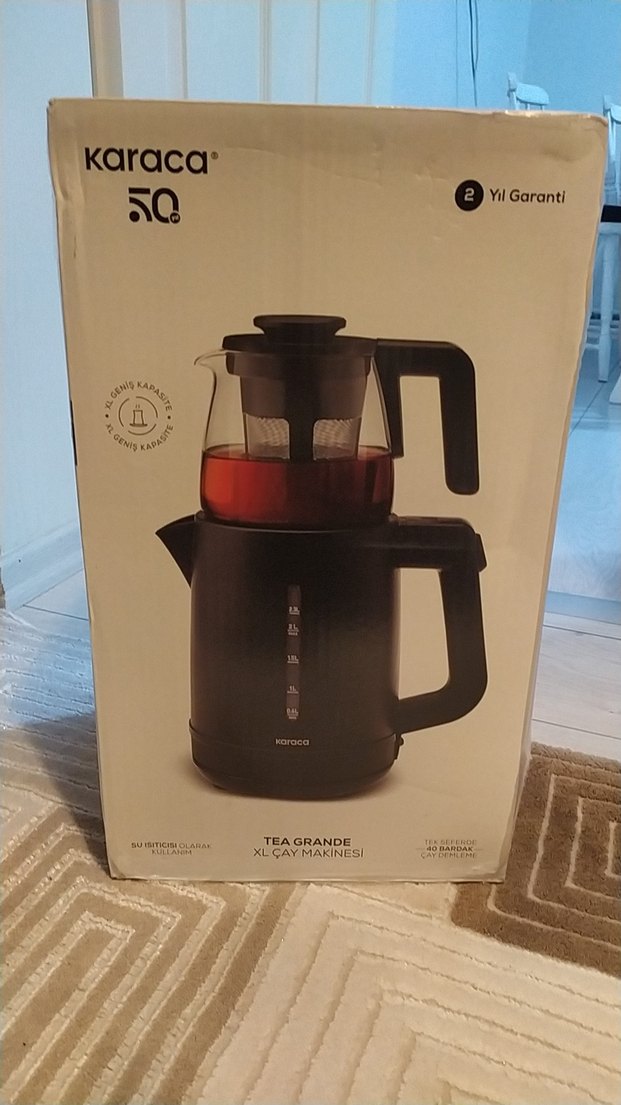 Karaca XL siyah çay makinesi, cam demliği ve siyah tabanı ile 2 yıl garanti sunar. Su seviyesi göstergesi ve demliği bulunur.
