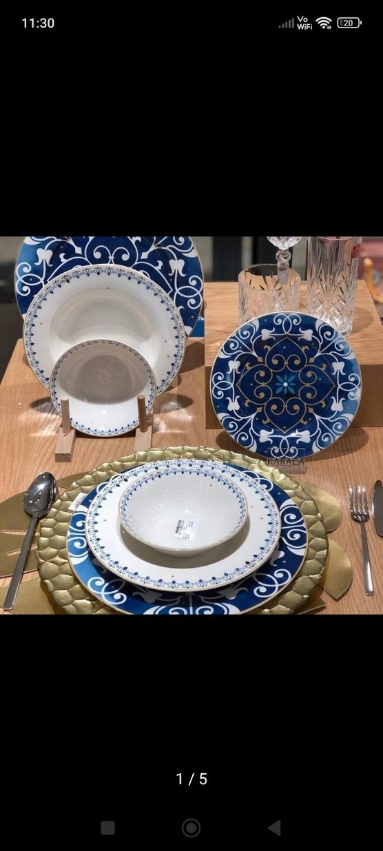 Karaca deep sea koyu mavi ve beyaz desenlere sahip tabak ve kaselerden oluşan yemek takımı.24 parçadan oluşmaktadır sıfır ve kutuludur