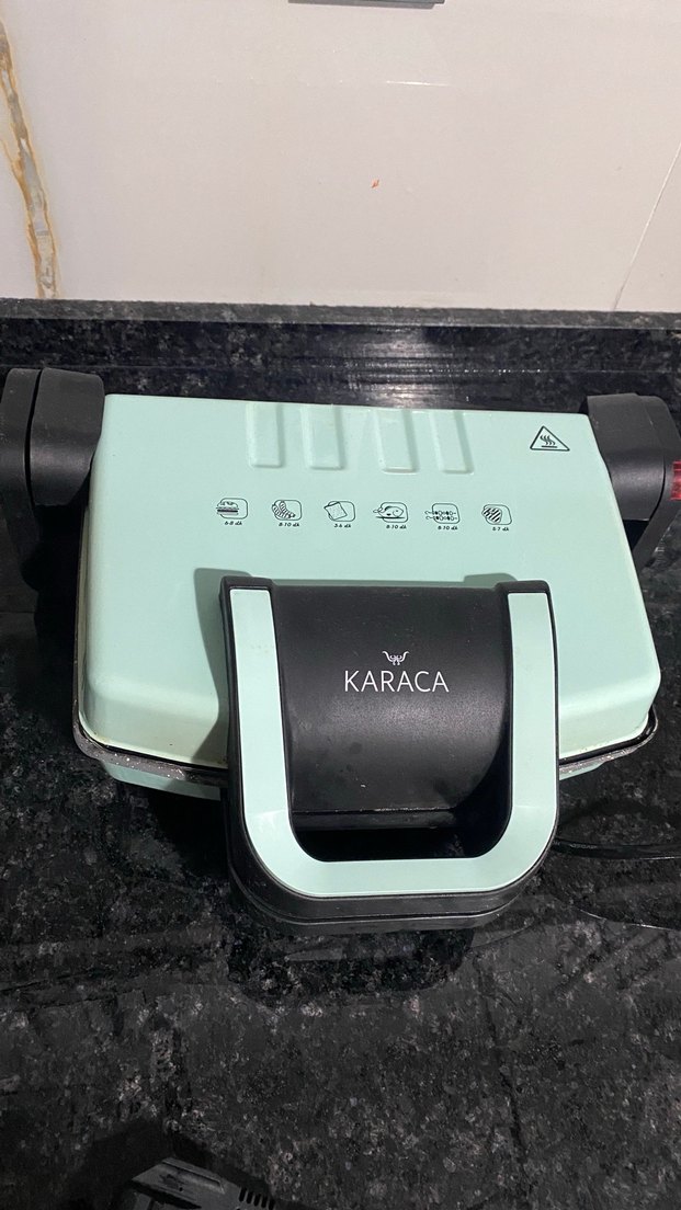 Karaca marka koyu yeşil tost makinesi, sağlam tutma sapı ve üstünde kolay kontrol ikonları ile tost yapmayı kolaylaştırır. Göründüğü gibidir sorunsuz çalışıyor