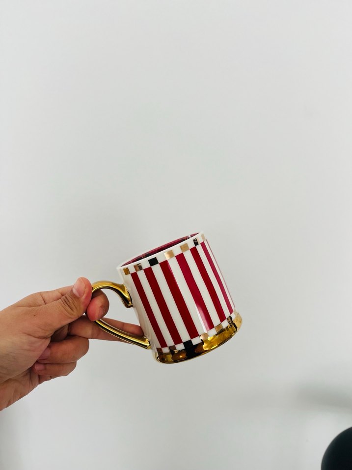 Canlı kırmızı dikey çizgiler ve kulp ile tabanında altın detaylar bulunan renkli bir kupa. ☕
