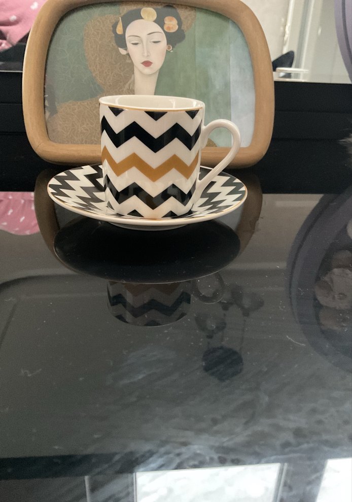 Siyah ve altın zigzag desenli beyaz fincan ve tabağı, modern ve şık tasarıma sahip. ☕