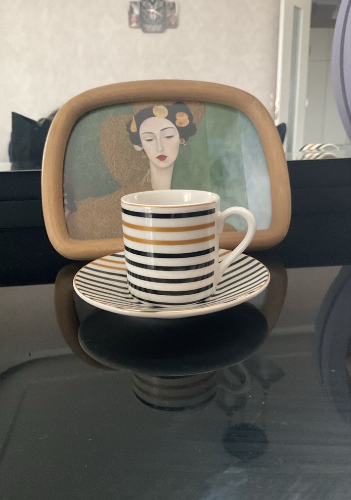 Küçük kulplu beyaz kahve fincanı ve tabağı, siyah ve altın renkli çizgilerle süslenmiştir. ☕son fiyat