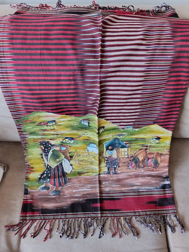 Karadeniz boyama çok renkli çizgilerle bohem tarzda, dokuma kumastan . Kırsal sahne baskısı ve püsküllü kenarları bulunur. örtü Hiç kullanılmadı.93*50 saçaklı.saçaksız 81*50