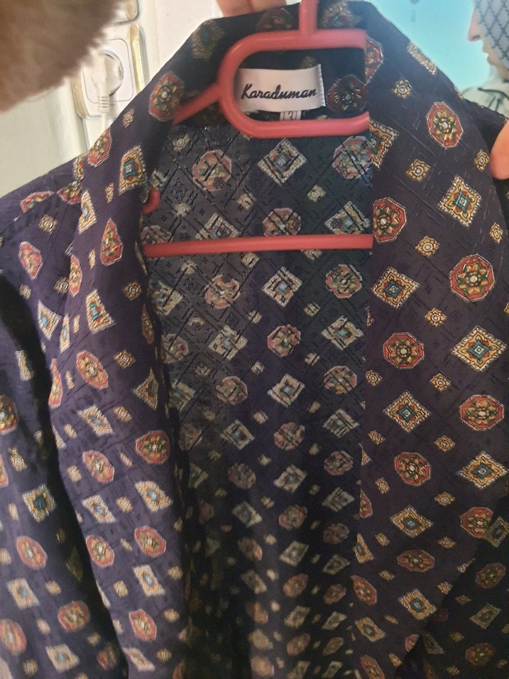 Karaduman markalı, desenli, çok renkli, koyu tonlarda, notalı yaka ve düğmeli önü olan uzun kollu, bol kesim midi boy bohem röpteşambir