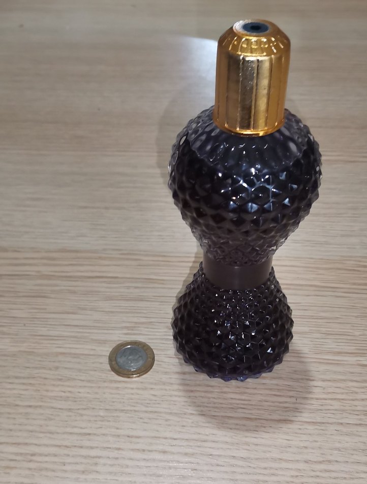 Altın kapaklı, Kristal șișede Karagül kolonyası. Şişe boyutu yanındaki madeni para ile gösterilmiştir. Kapağı görselde açtım ama ürünün iç kapğı henüz açılmadı kullanılmadı.