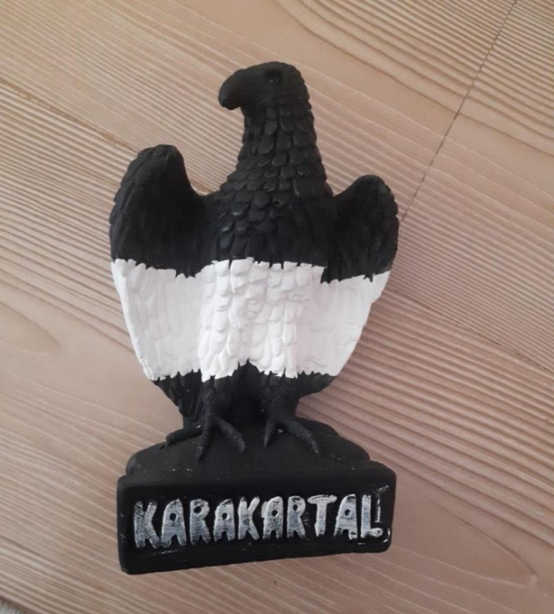 Karakartal yazılı, siyah-beyaz el yapımı kartal figürü. Güçlü ve koyu renk tasarıma sahip.