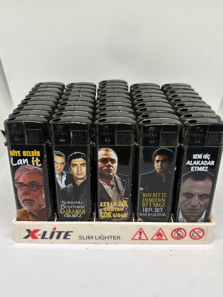 Çeşitli karakter görselleri ve alıntılar içeren siyah slim çakmak seti, koleksiyon veya hediye için uygun. Her çakmak farklı tasarıma sahip.