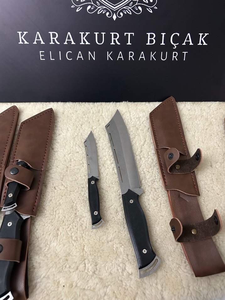 Karakurt bıçak koyu renk saplı bıçak ve kahverengi deri kılıflarla birlikte gelir. Keskin bıçaklar ve sağlam yapı sunar.