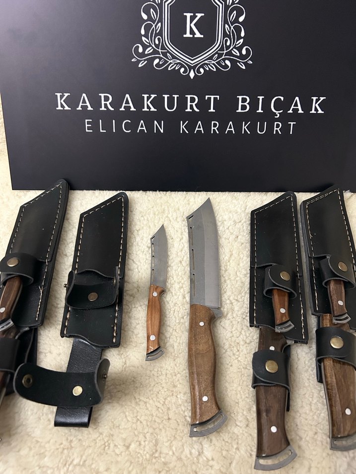 Karakurt Bıçak marka, kahverengi ahşap saplı ve deri kınlı bıçak seti. Keskin ve kullanışlı bıçaklar içerir.