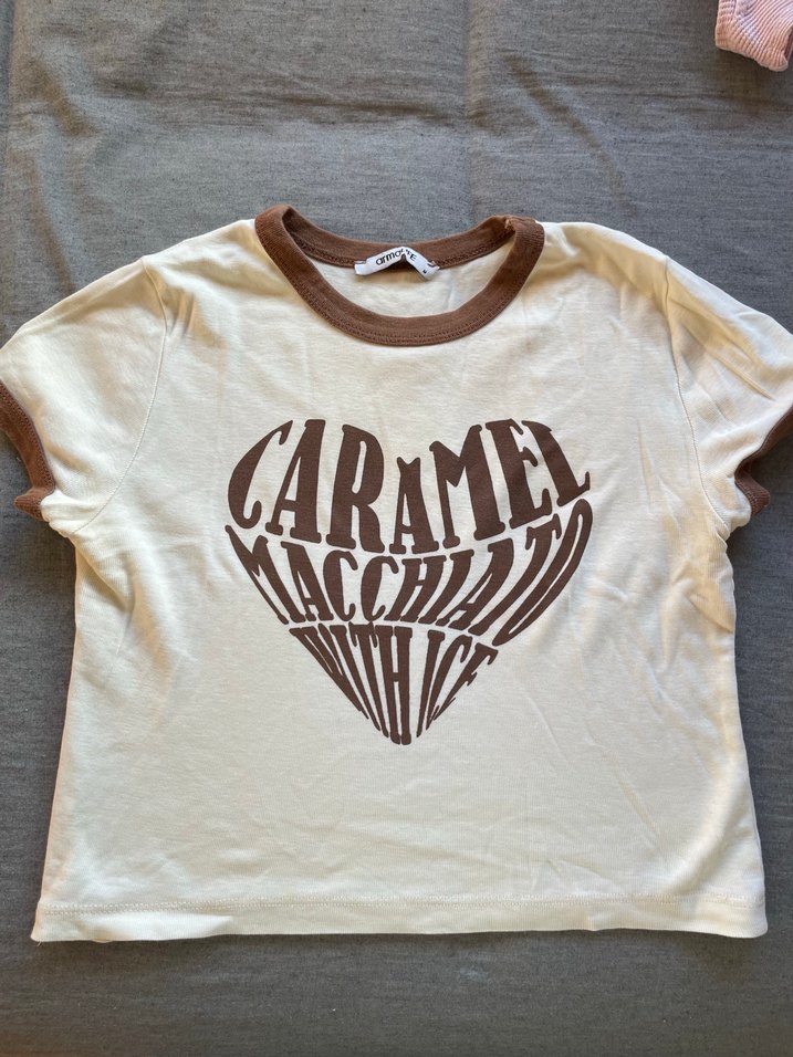 Kısa kollu, yuvarlak yaka pamuklu tişört, karamel desenli baskıyla rahat ve trend bir görünüm sunar.