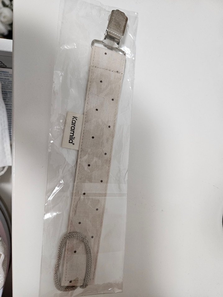 Karamila marka, küçük noktalarla bej renkte emzik askısı. Metal klipsiyle emziği güvenle tutar.