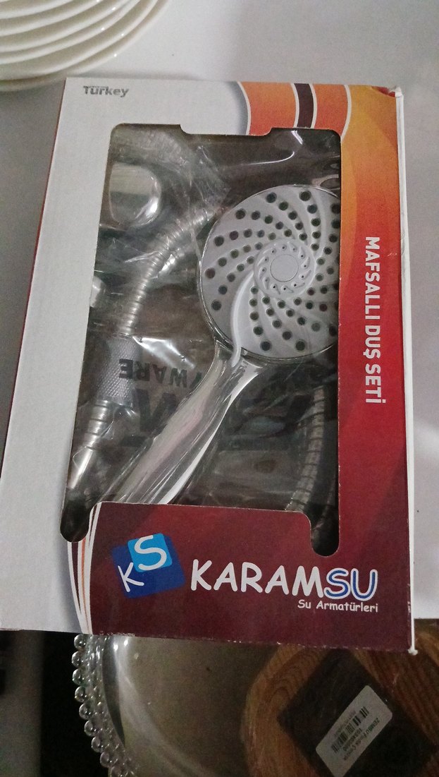 Karamsu gri duş seti, mafsallı esnek kol ve çoklu su çıkışı sağlayan yuvarlak başlığa sahiptir. Türkiye üretimi.