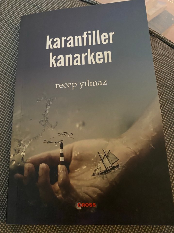 Recep Yılmaz'ın "Karanfiller Kanarken" romanı, kapağında deniz temalı soyut bir el, deniz feneri ve gemi görselleriyle derin temalar işliyor.