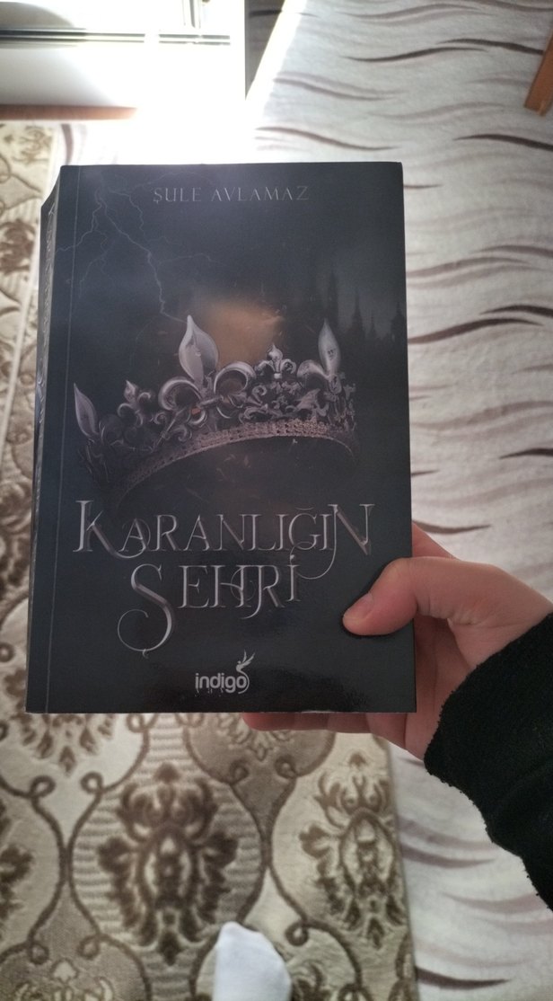 Şule Avlamaz'ın "Karanlığın Şehri" romanı, kapağında taç figürüyle karanlık ve gizemli bir şehri anlatıyor. Indigo yayınevinden.