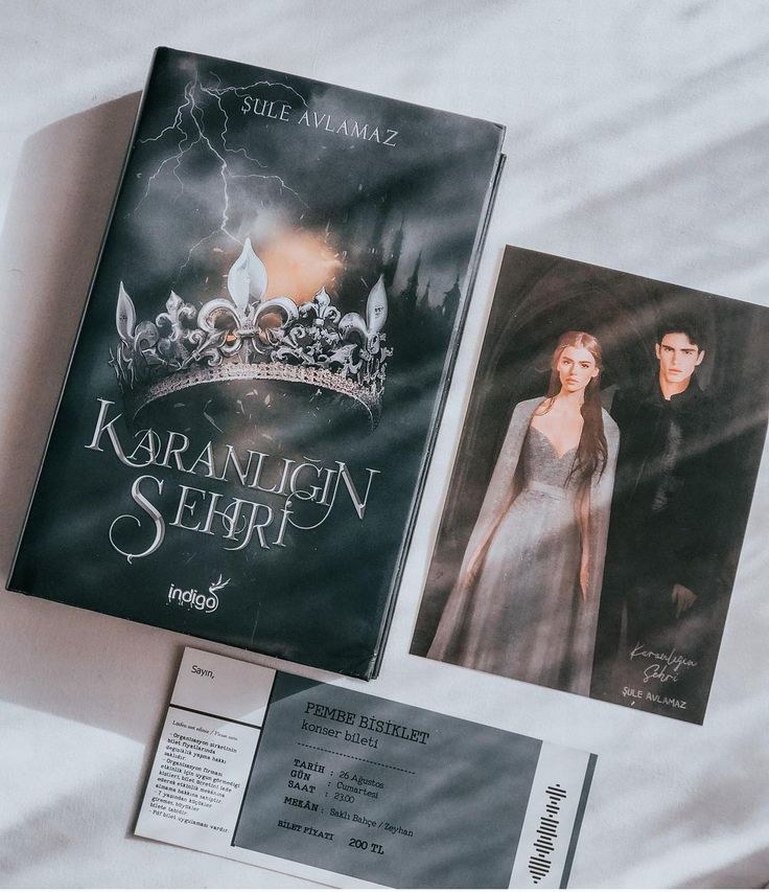 Şule Avlamaz'ın Karanlığın Şehri adlı romanı, taçlı karanlık bir kapak ve Pembe Bisiklet konser bileti içerir.