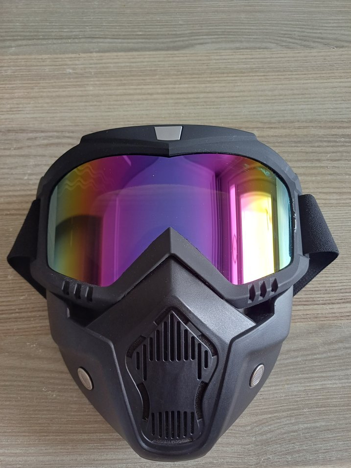 Karanlık çok renkli kamuflaj desenli, şeffaf vizörlü plastik motosiklet maskesi. Motorumu sattığım için alır almaz satmak zorunda kaldım