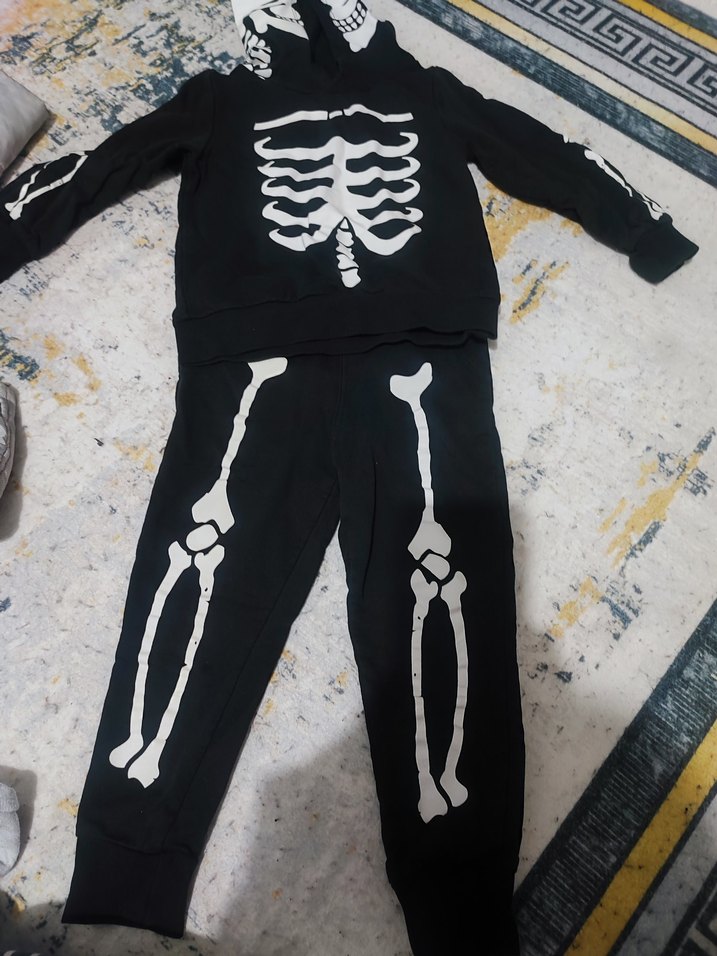 Yüksek yakalı ve uzun kollu, siyah örme kumaş üzerine baskılı iskelet desenli, dar kesim çocuk goth kostümü.