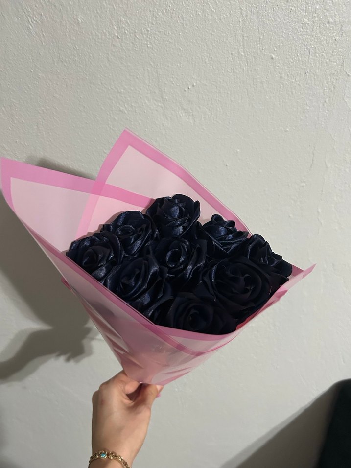 Siyah yapay güllerin pembe ambalajla sarıldığı, gotik ve minimalist tarzı avant-garde dokunuşla birleştiren buket.