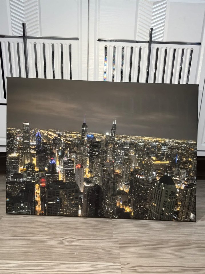 Karanlık gri tonlarda, ışıklı binalar ve sokaklarla dolu şehir manzarasını gösteren tablo. Şehir atmosferini canlı şekilde yansıtıyor. ️kanvas tablo dijital baskı 50x70 cm