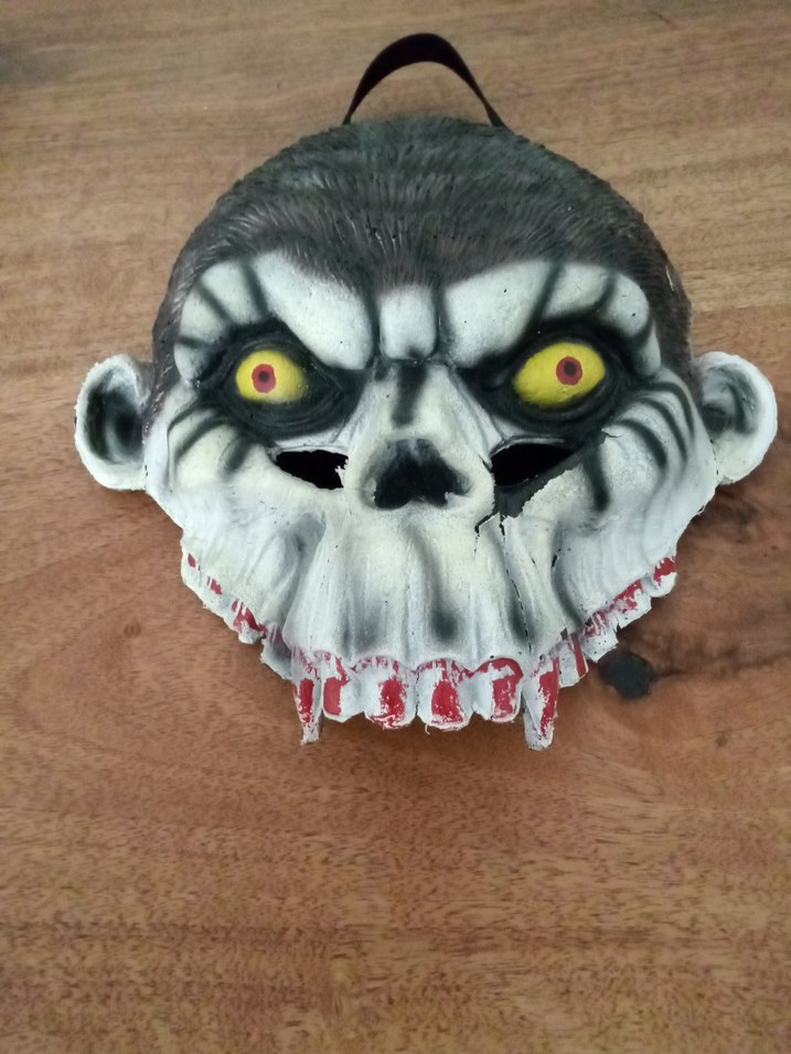 Sarı gözlü ve kırmızı detaylı karanlık kafatası maskesi, kahverengi takma kayışıyla aksiyon figürleri için uygun.