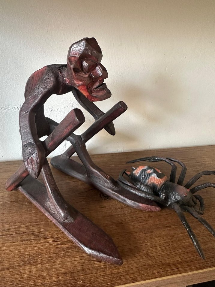 Kahverengi ahşaptan yapılmış, stilize insan figürü ve örümcek tasarımına sahip karanlık tonlarda figürin. Rustik ve el yapımı görünümde.