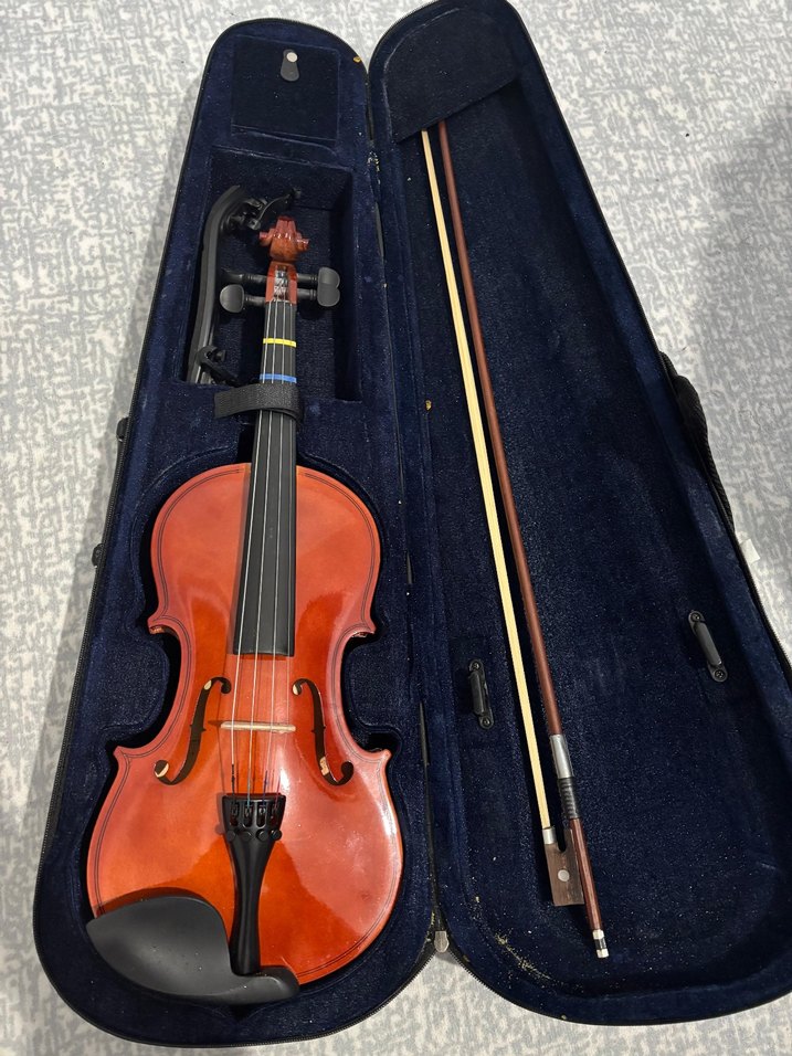 Karanlık kahverengi keman ve yayı, yumuşak astarlı bir kılıf içinde saklanıyor. Parlak yüzeye ve standart akort burgularına sahip.
