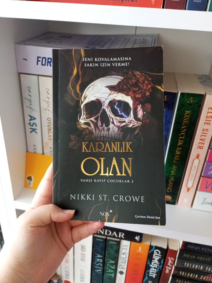 Nikki St. Crowe'nin "Karanlık Olan" adlı romanı, kafatası ve çiçeklerle süslü karanlık bir kapak tasarımına sahip. Vahşi Kayıp Çocuklar 2 serisinden.