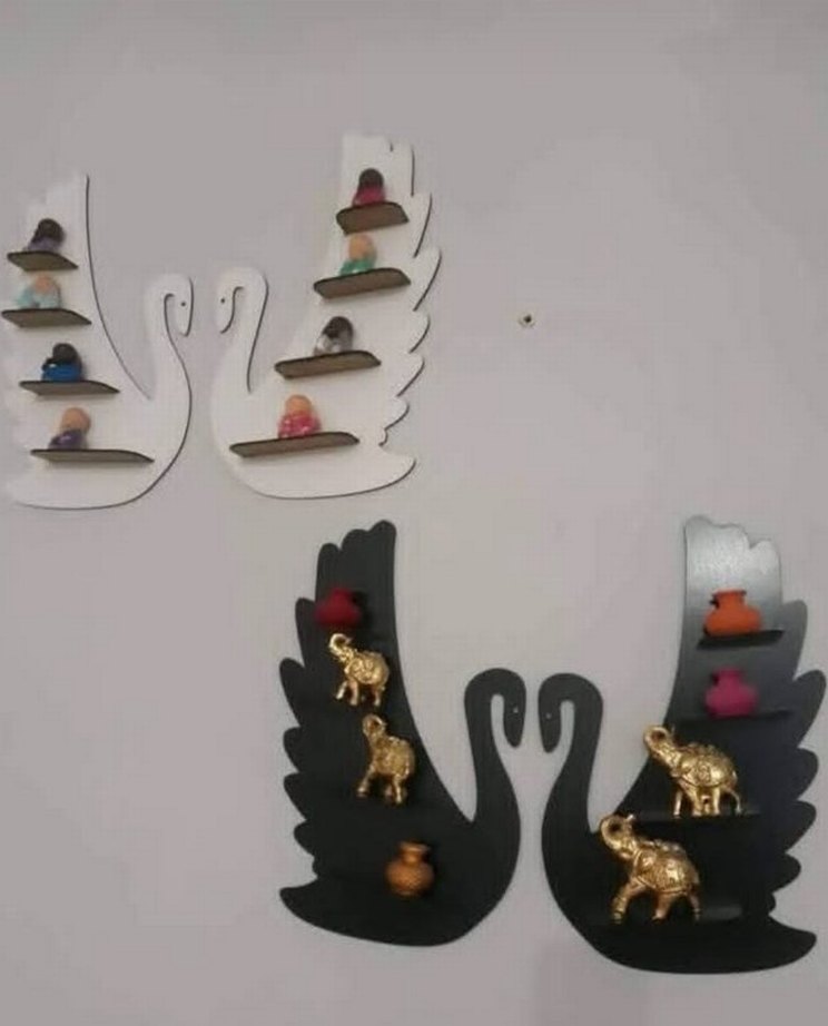Küçük dekoratif eşyalar için çok renkli ve karanlık renkli kuğu şeklinde raflar.