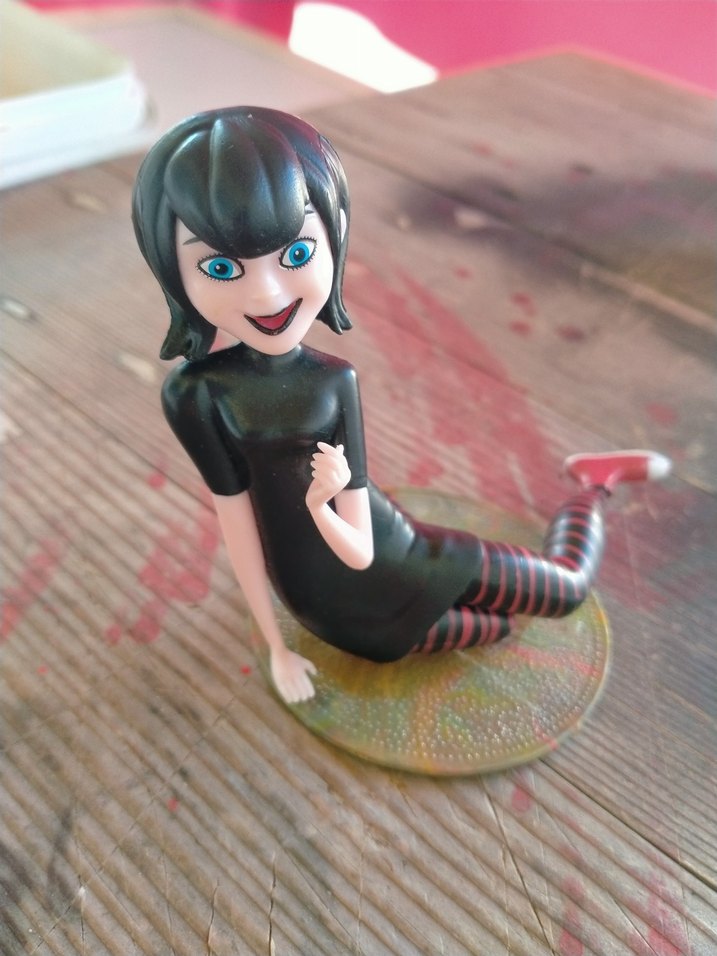 Mavi gözlü, çizgili taytlı karakterin oturduğu siyah aksiyon figürü, yuvarlak taban üzerinde duruyor. Canlı ve ifade dolu pozda. Bir ayağına kırık eksik var 13 cm