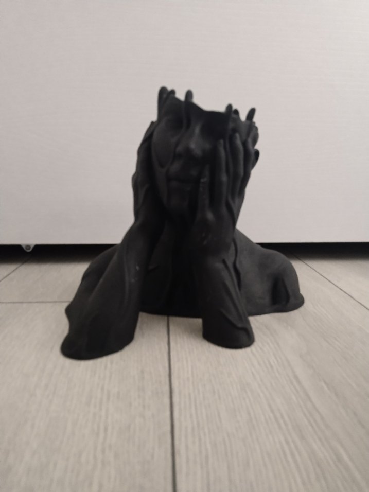 Karanlık siyah renkte, elleriyle yüzünü tutan düşünceli bir figürin.