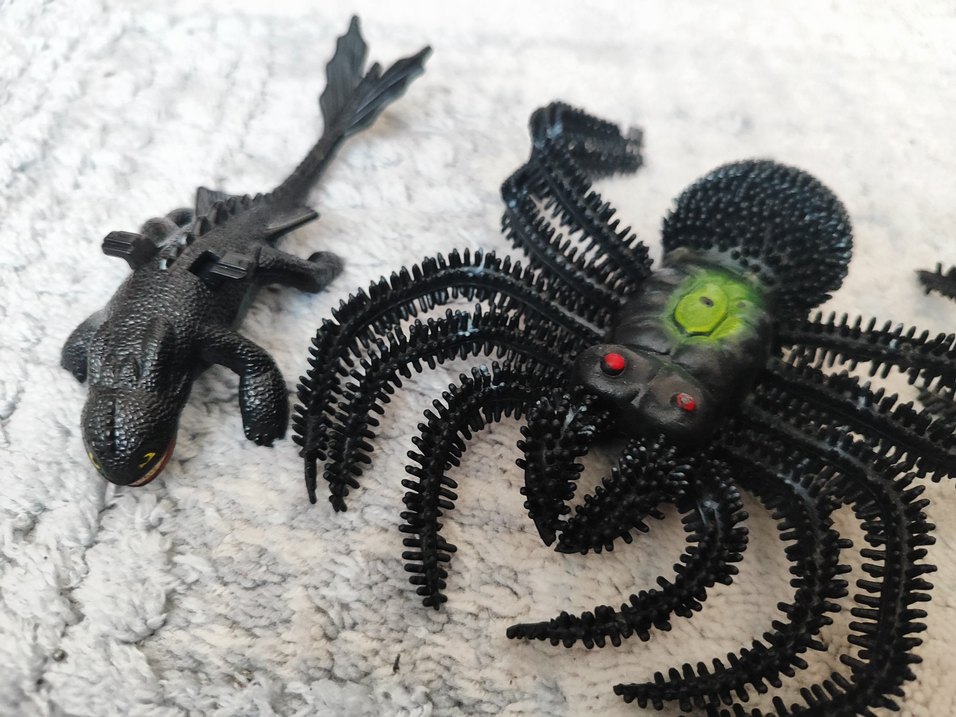 Kırmızı gözlü, siyah renkli, detaylı bacaklara sahip örümcek aksiyon figürü. Sırtında yeşil bir işaret bulunur. Karanlık ve dokulu tasarım.