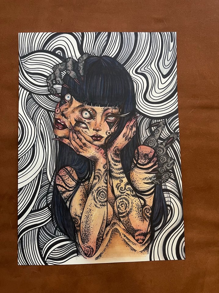 Karanlık tonlarda, çoklu yüzler ve detaylı desenlerle soyut bir kadın figürü, siyah beyaz kıvrımlı arka planda yer alıyor.
