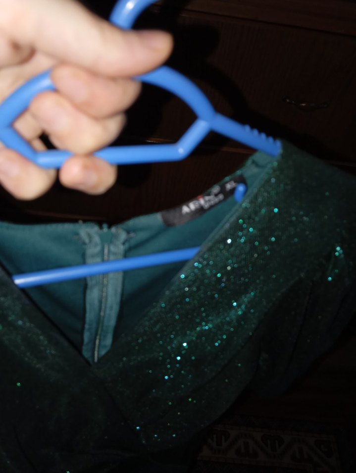 Karanlık yeşil, parlak detaylı gece elbisesi, arka fermuar kapamalı. ✨