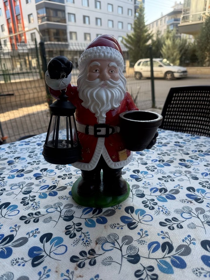 Noel Baba figürü, elinde fener ve kase tutuyor, koyu ve beyaz renklerde, şık tasarımlı.