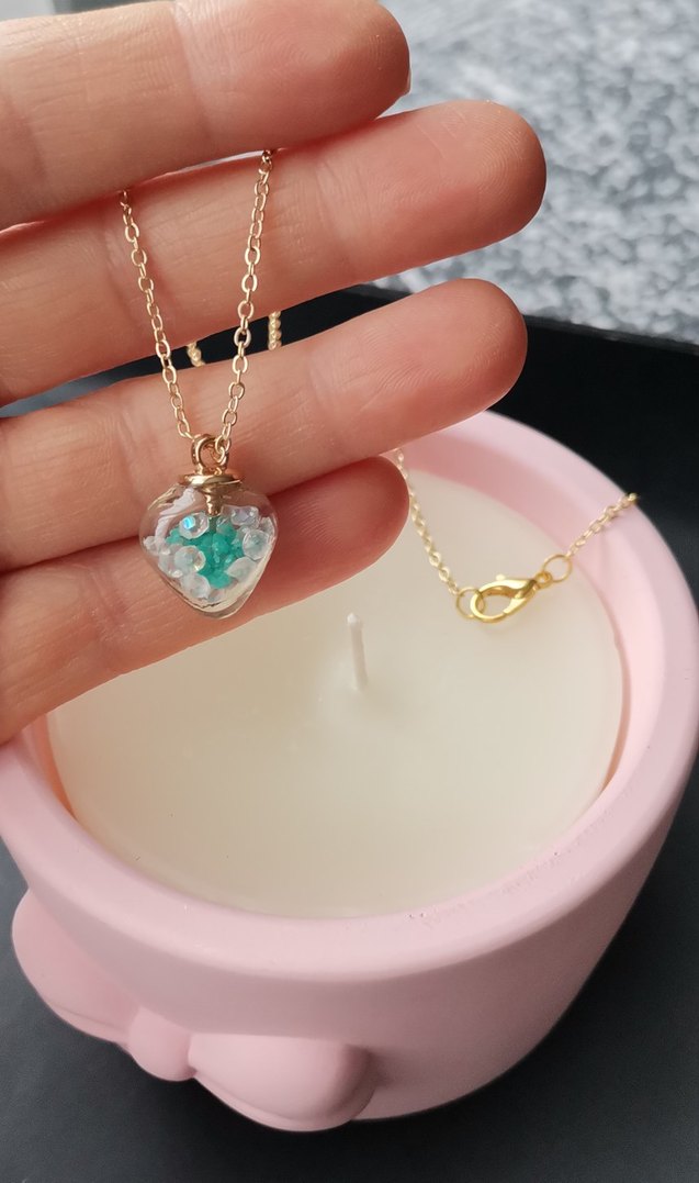 Altın renkli zincir detaylı, içinde küçük süslemeler bulunan şeffaf kalp uçlu kolye. Midi uzunluk, günlük sokak stiline uygun minimal tasarım.