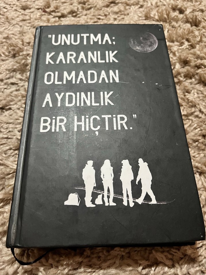 "Unutma: Karanlık olmadan aydınlık bir hiçtir." sözüyle kaplı, dört kişinin silüetlerinin bulunduğu roman.
