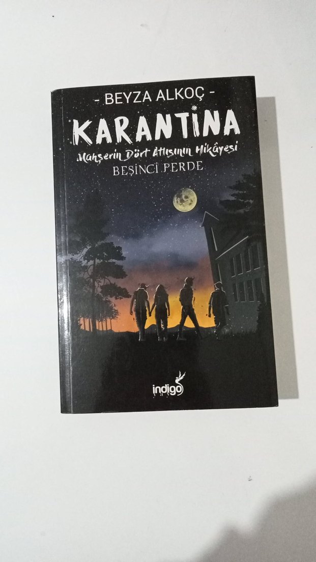 Beyza Alkoç'un "Karantina" adlı romanı, Mahşerin Dört Atlısının hikayesini beşinci perdeyle anlatıyor. Kapakta gece manzarası ve üç figür yer alıyor.