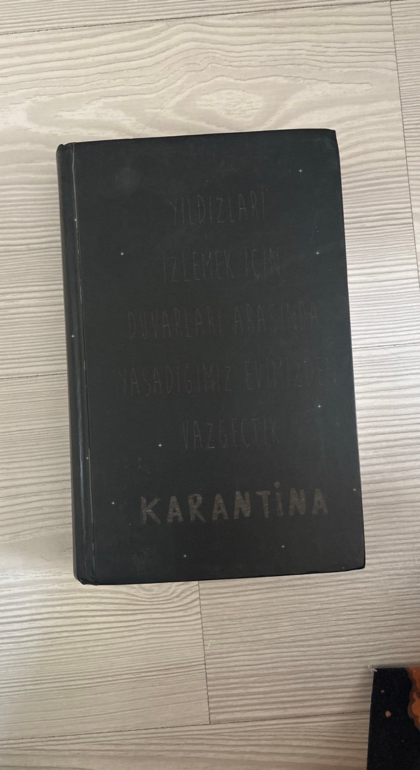Ön yüzünde hafif kabartmalı yazılar bulunan siyah kapaklı 'Karantina' adlı roman. Mat kaplamalı, sade tasarımlı kitap.