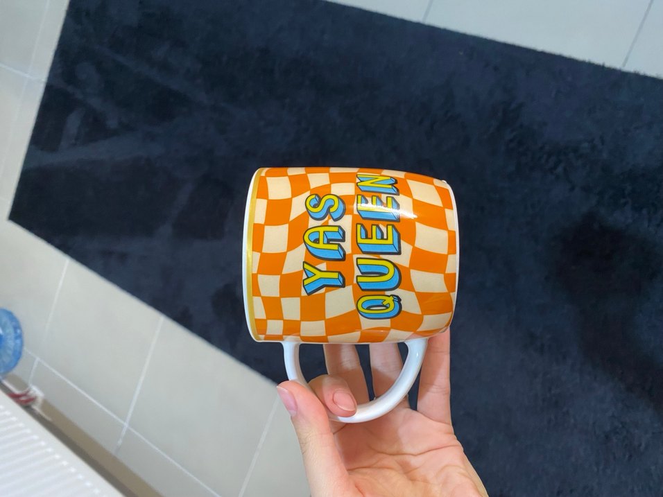 Turuncu renkli, kareli desenli ve "YAS QUEEN" yazılı renkli kupa bardak. Beyaz saplı, canlı tasarıma sahip. ☕