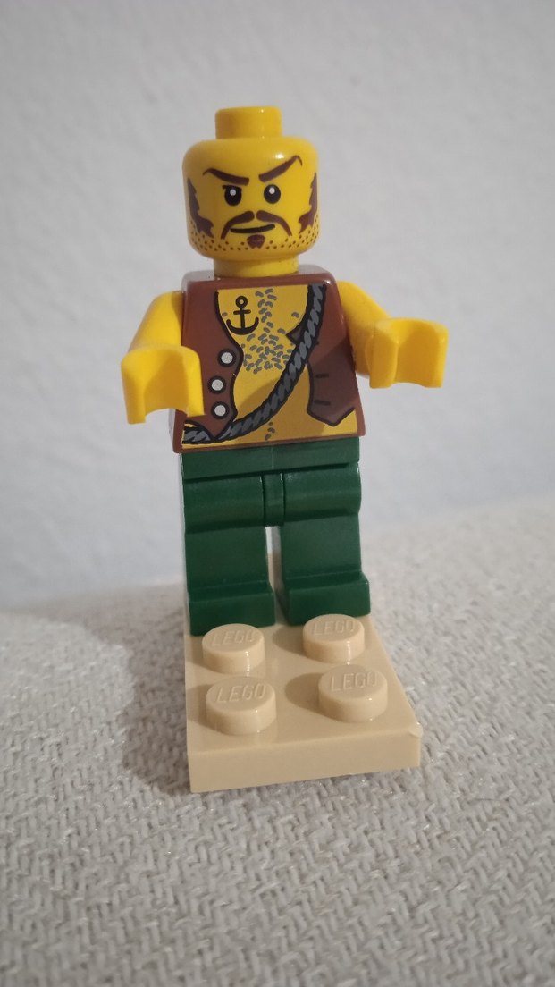 Sarı renkte, dövmeli ve sakallı detaylara sahip Lego korsan figürü, yeşil pantolonlu ve bej Lego kaidesinde duruyor. ☠️