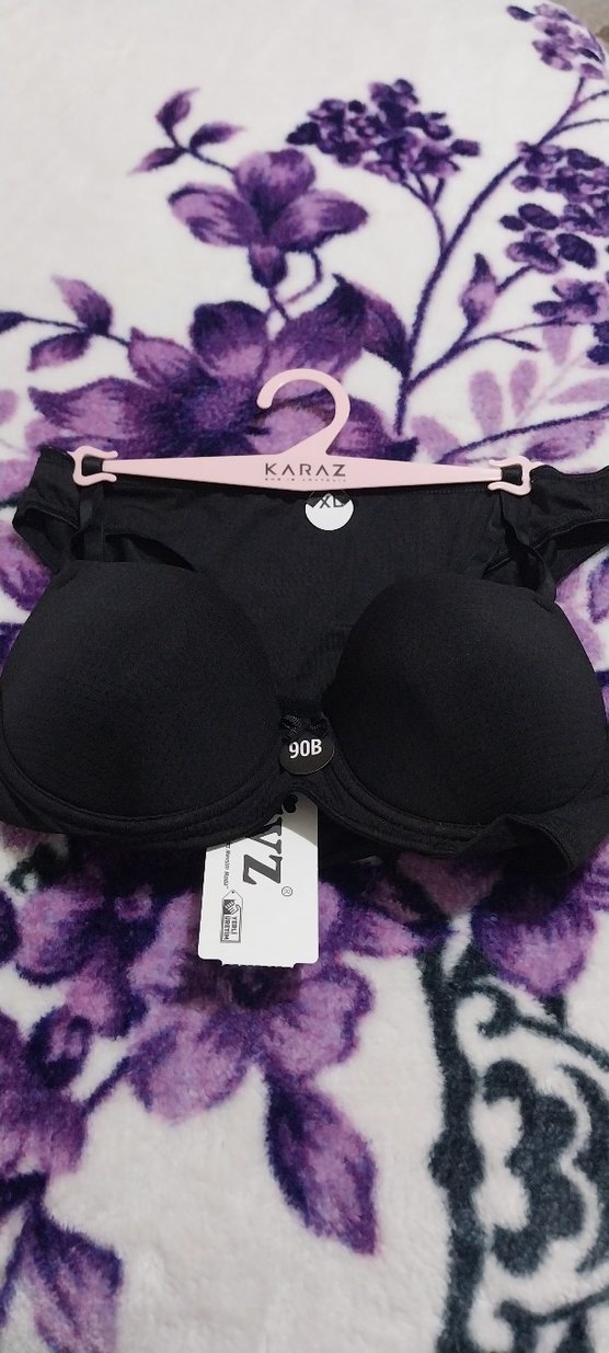 Siyah renkli, kısa kesim goth tarzı spor sütyeni, baskılı detaylara sahip ve 90B bedenindedir. Karaz markası üründür. Sütyen kilot takımı