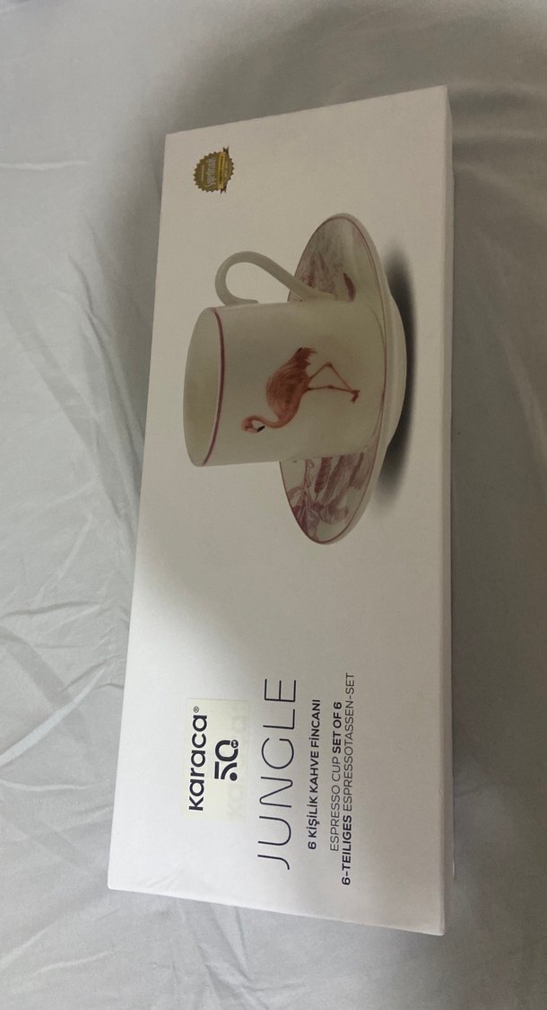 Karcaca Jungle 6 kişilik beyaz espresso fincan ve tabağı seti, flamingo desenlidir. Espresso servisinde şık bir seçim. ☕