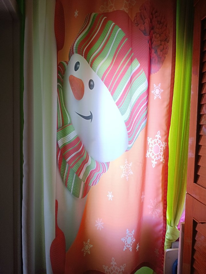Renkli karikatür baskılı perde, çizgili şapka ve atkı takan kardan adam figürü ile kar taneleri desenine sahip. en 1.50 yükseklik 1.80