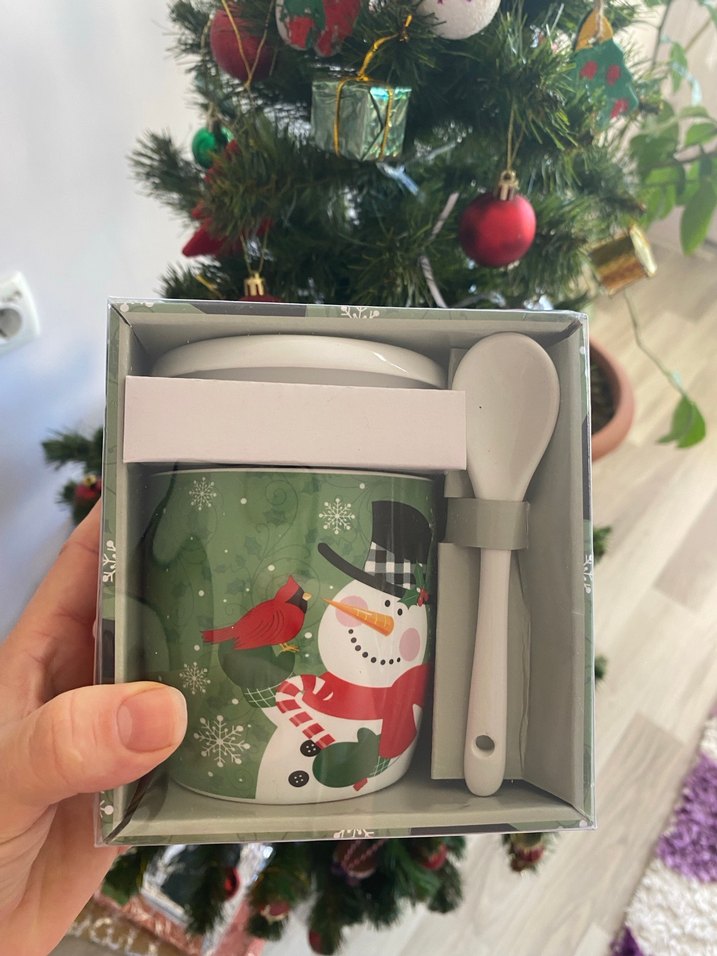 Beyaz seramik kupa, neşeli kardan adam desenine sahip olup, uyumlu kapak ve kaşık ile birlikte gelir. ❄️