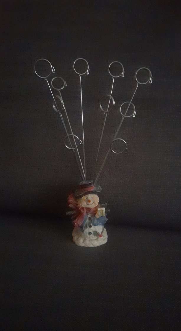 Kardan adam figürüne sahip, yukarı doğru uzanan metal klipslerle fotoğraf veya not tutucu. Beyaz ve koyu renklerle, kırmızı atkı ve şapka detaylı.