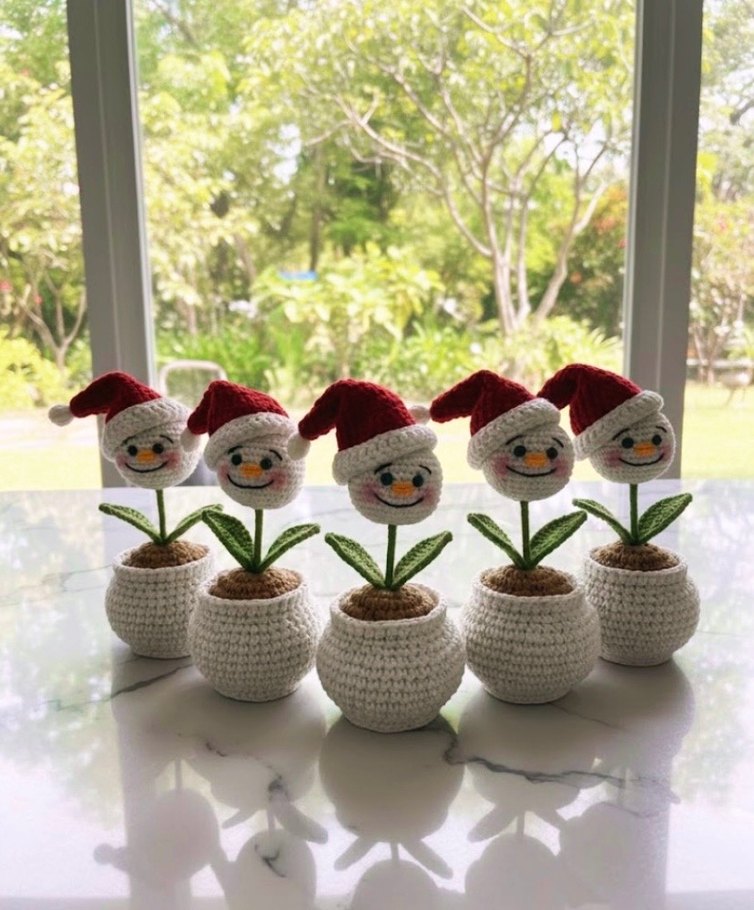 El yapımı örgü saksılar, kırmızı şapkalı gülen kardan adam figürleri ve yeşil yapraklarla tasarlanmıştır. ❄️