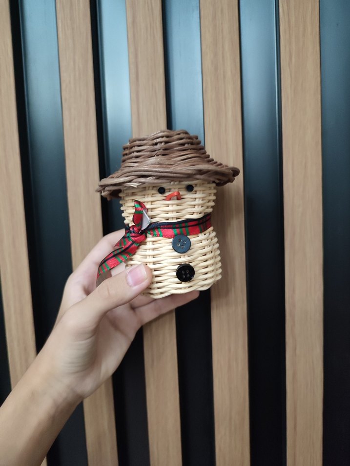 Hasırdan yapılmış, renkli detaylara sahip, kahverengi şapkalı ve düğmeli figürin, ekose fularla tamamlanmıştır.