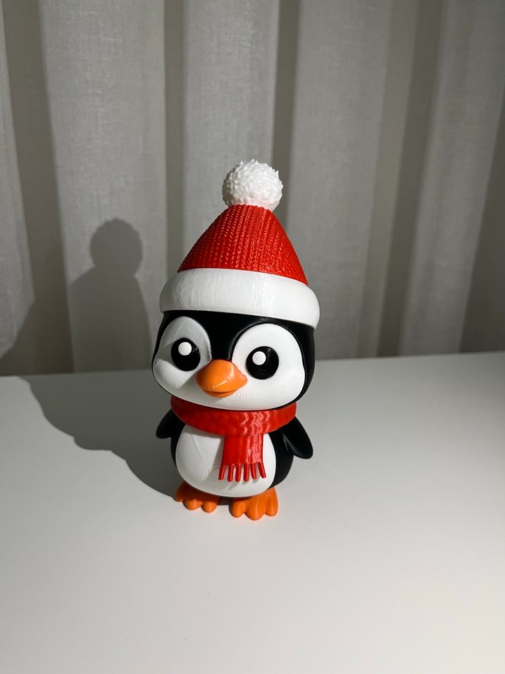 Kırmızı bere ve atkı takan, turuncu ayaklı renkli penguen biblo. ❄️ 14cm