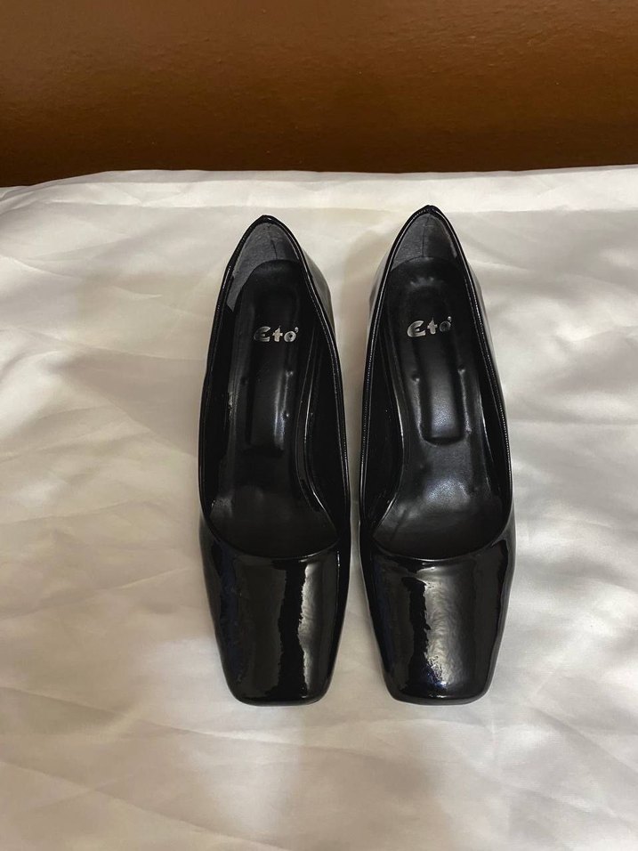 Kare burunlu, tokalı siyah kadın stiletto. Kauçuk malzemeden, minimalist ve gotik tarzda, ofis kullanımı için uygun, desensiz şık tasarım.