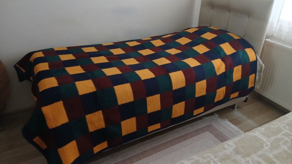 Kare desenli, koyu çok renkli karelerden oluşan bu battaniye sıcak ve rahat bir dokunuş sağlar. Yatağı rahatça örter. ️eni 150 boyu 200